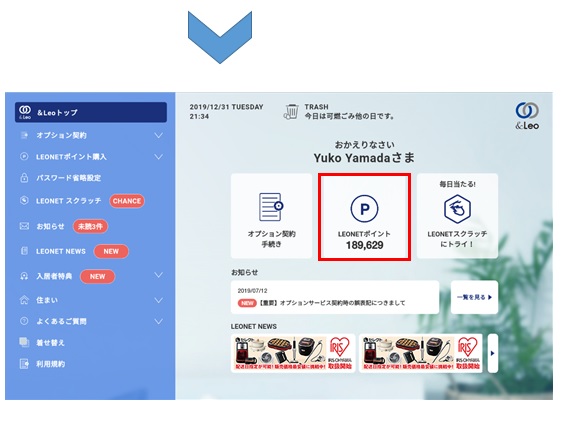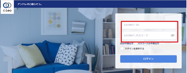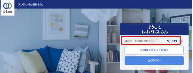 LEONET IDとパスワードをご入力いただきログインしてください。ログイン後、画面上部に、現在のLEONETポイント残高が表示されております。