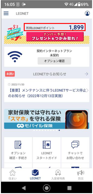 その後、赤枠部分にLEONETポイントの残高が表示されます。