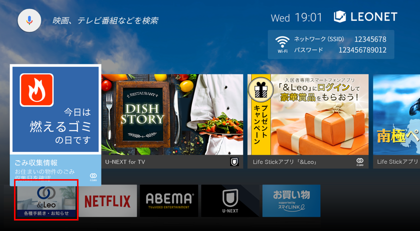 Life Stick起動後、サービストップ画面から「&Leo 各種手続き・お知らせ」に入ります。