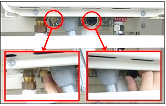 2)給湯器の下に2カ所設置されている「水抜栓」がしっかり閉まっているか確認します。