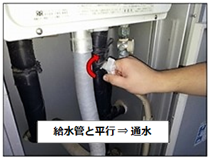 3)給湯器の下の給水バルブが通水状態(給水管と平行)になっていることを確認します。
