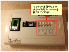 3)室内分電盤にある浴室換気乾燥機のブレーカーを「切(OFF)」にして、約20秒間待ちます。